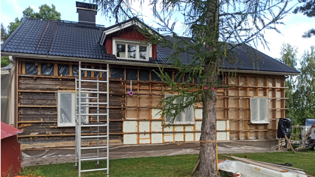 Julkisivuverhous ja vanhat eristeet poistettiin asiakkaan toimesta. Käytimme kohteessa kahta erilaista ruiskutettavaa uretaania. Sisin (ensimmäinen) kerros eristettiin n. 10 cm kerrosvahvuudella avosoluisella uretaanilla. Ulommainen (toinen kerros) ruiskutettiin kaasutiiviillä uretaanilla. Avoimen solun uretaani toimii äänieristeenä ja hengittävänä rakenteena. Se asennettiin ilmansulkupaperia vasten. Uloimman umpisoluisen uretaanin tehtävä oli tehdä tuulensuoja. Erillisiä tuulensuojalevyjä ei enää tarvittu. Uretaanin päälle tuli panelointi.
