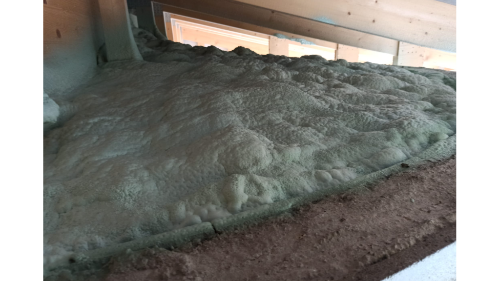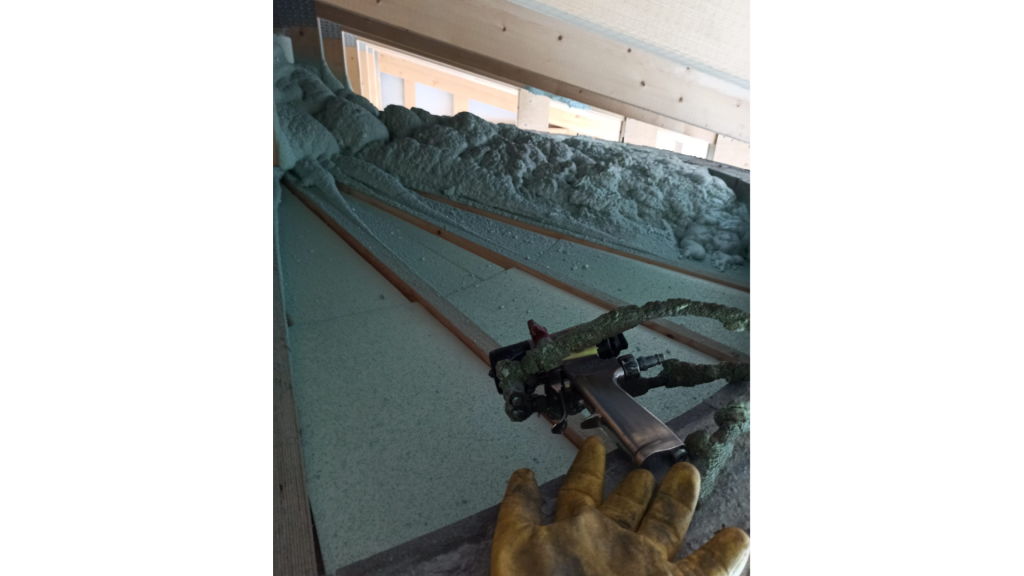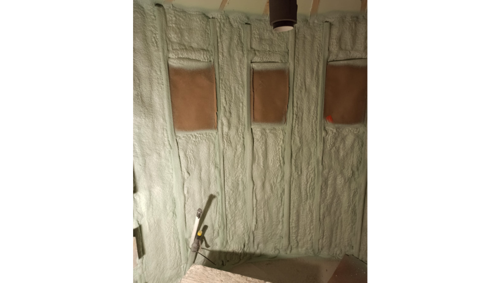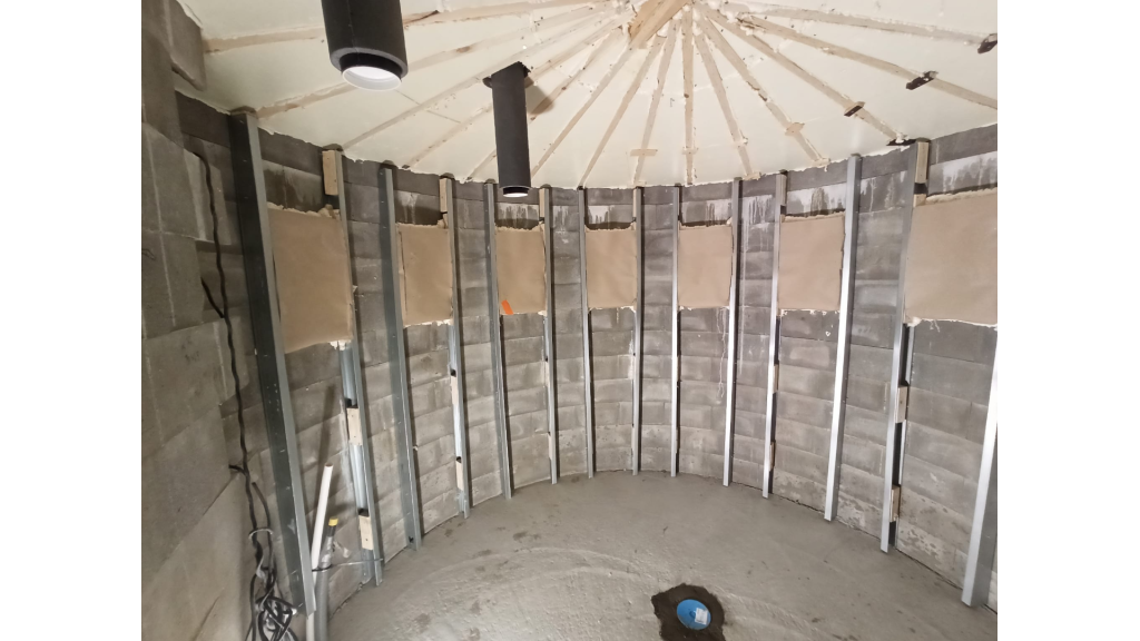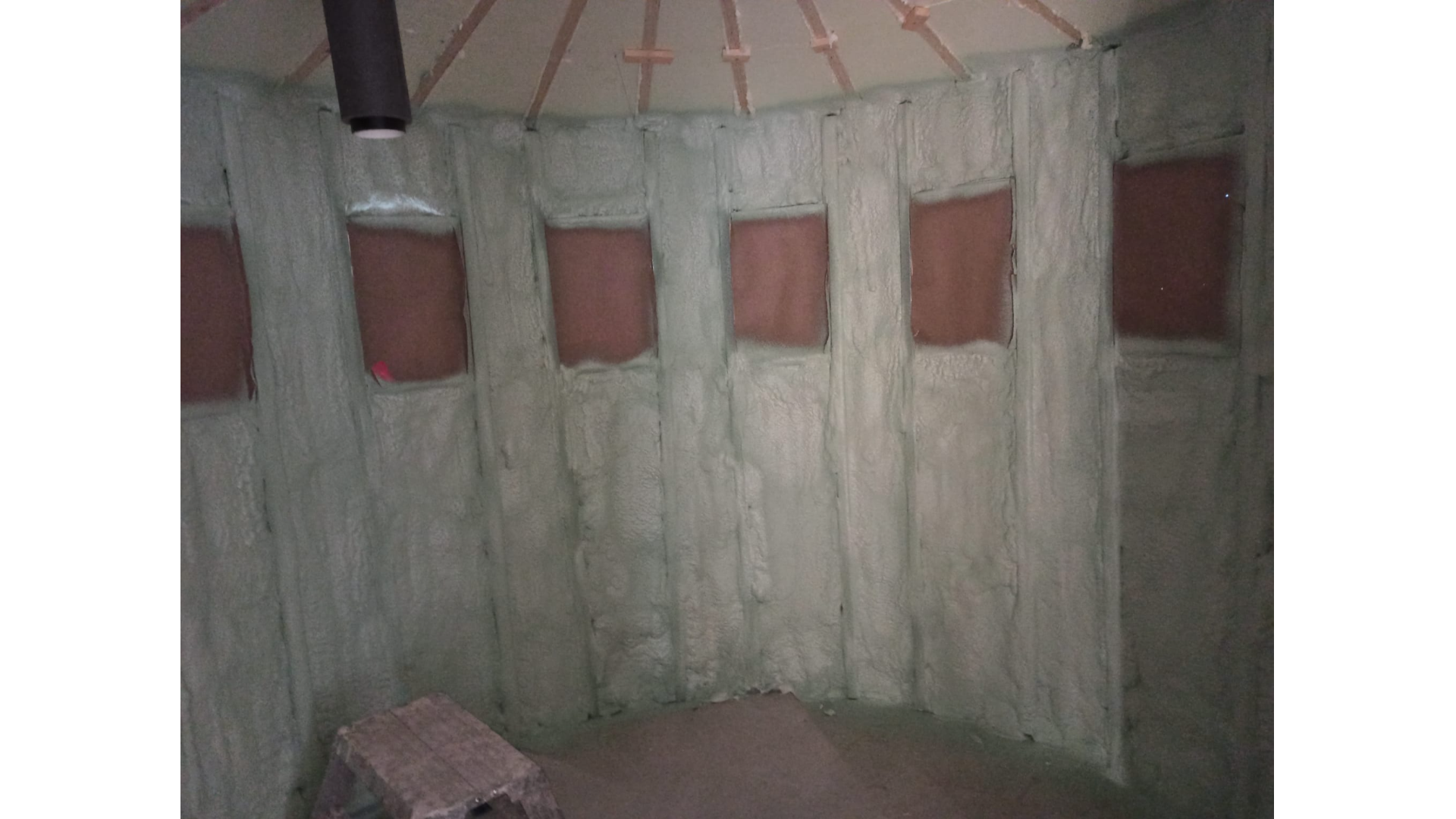 Torniin rakentuvan saunan seinät eristettiin sisäpuolelta kaasutiiviillä uretaanilla. Betoniharkoista muurattu seinärakenne oli koolattu metallirangalla ja ikkunat suojattu hyvin uretaaniroiskeita vastaan. Saunan kattorakenne eristettiin päältäpäin. Tila oli melko ahdas, onneksi mukaan oli pienikokoisin eristäjämme.