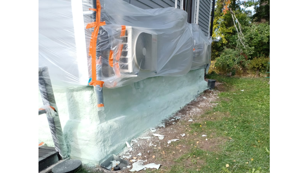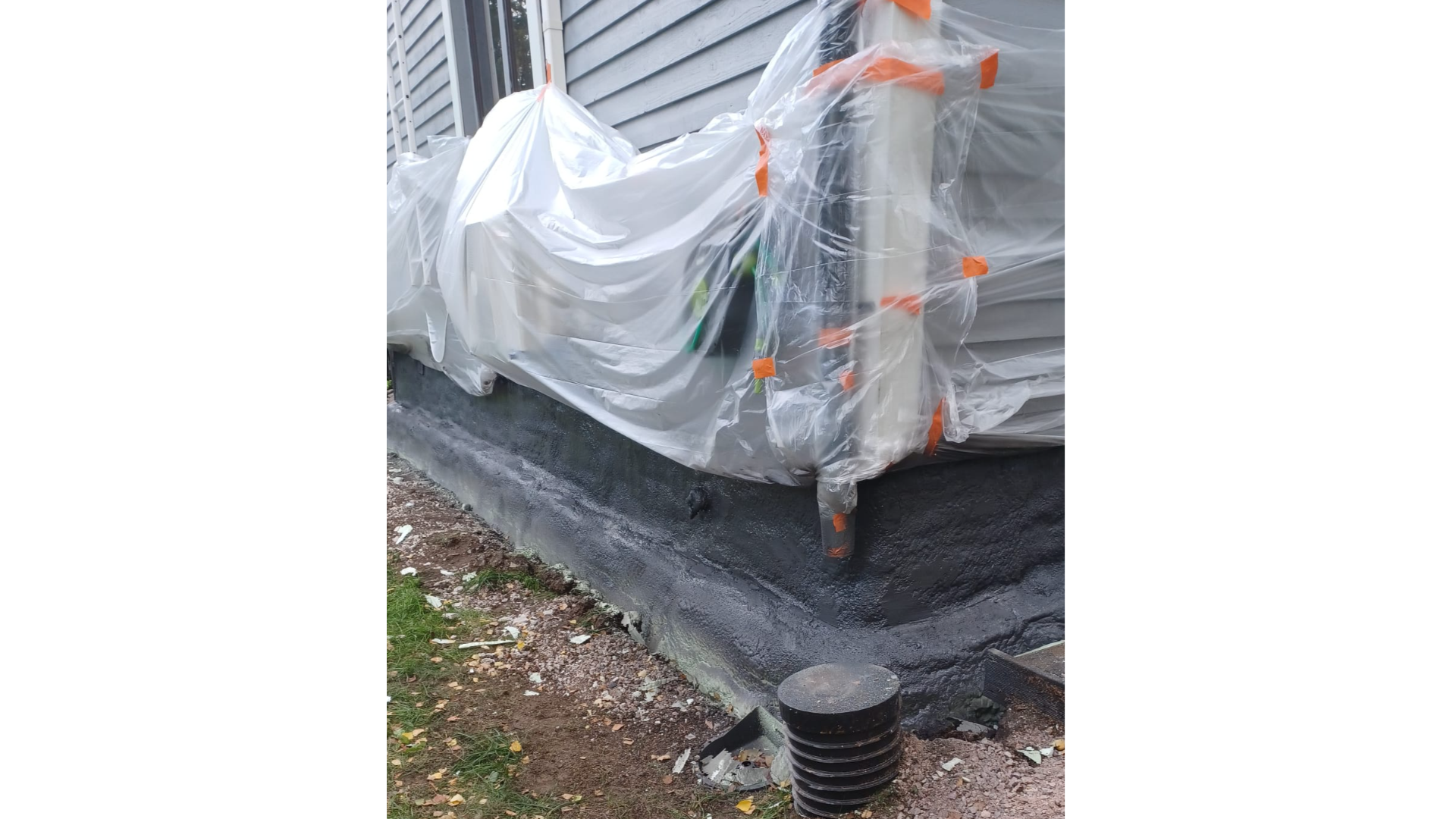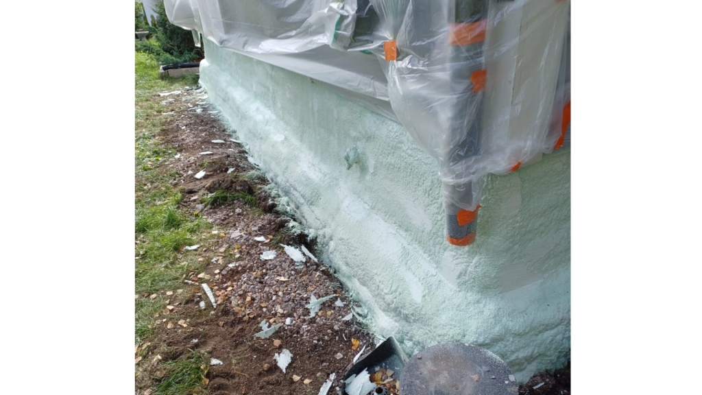 Eristimme rintamamiestalon sokkelin ulkoa päin ruiskutettavalla kaasutiiviillä uretaanilla. Maalarimme viimeisteli pinnan maalaamalla. Uretaanivaahto ei säily pinnalta hyvänä, jos se altistuu suoralle UV-valolle. Rakenteiden sisään jäävä eristys on aina hyvin suojattu valoa vastaan. Avoimelle pinnalle jäävä uretaanivaahto tulee aina suojata jollain pintakäsittelyaineella, esim. maalilla tai polyurealla.