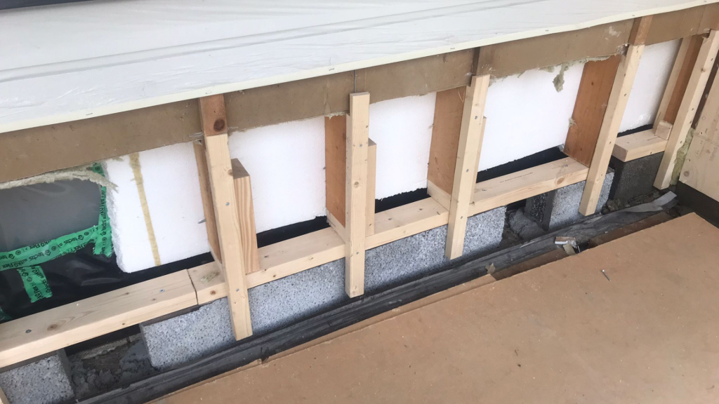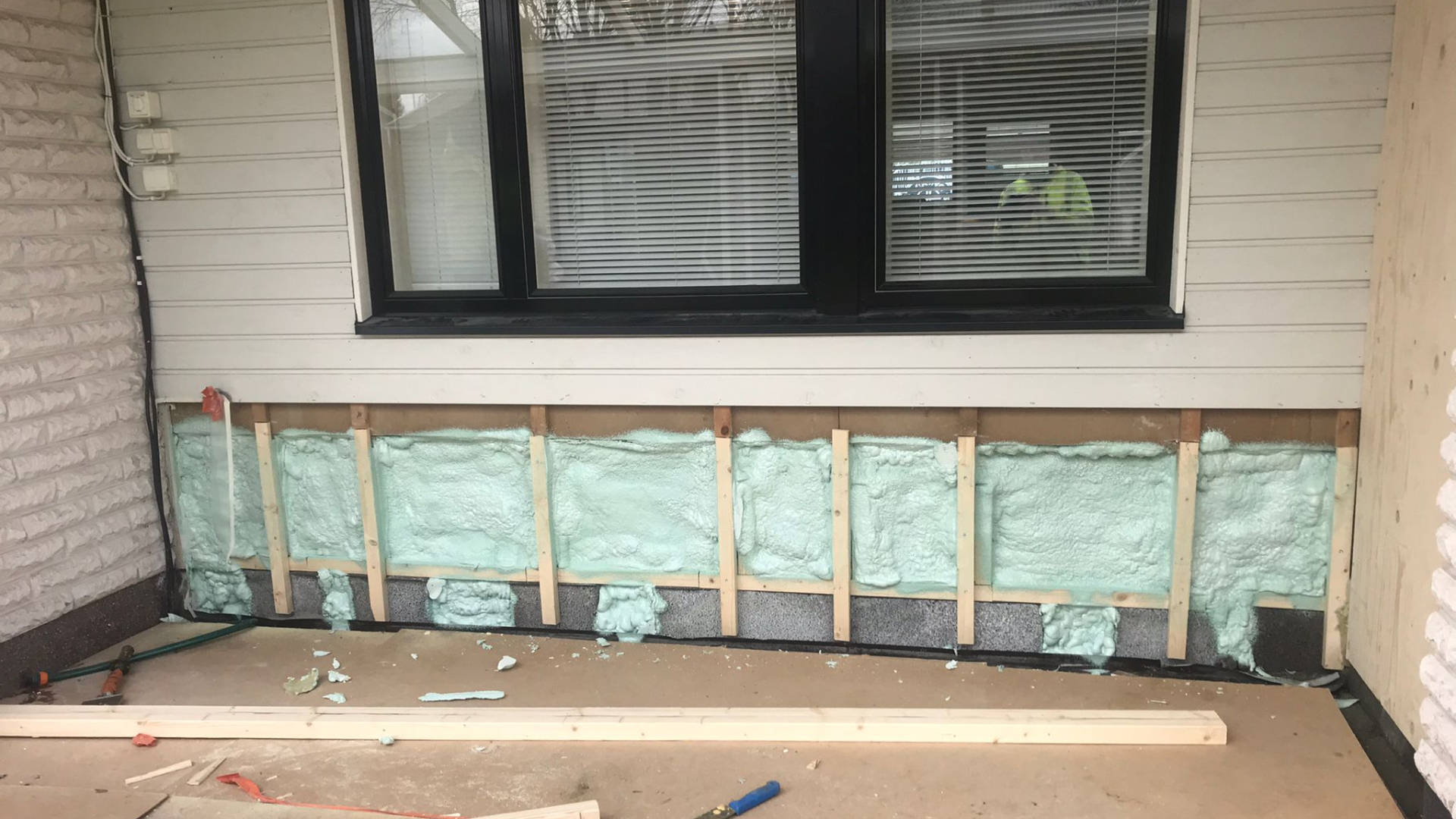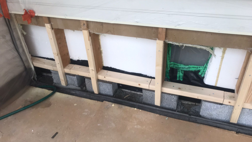 Kohteessa korjattiin valesokkelirakenne ulkoa päin. Ensin orgaaniset ainekset pois, kengitys harkoilla. Eristys kaasu- ja vesitiiviillä uretaanilla ja panelointi takaisin.