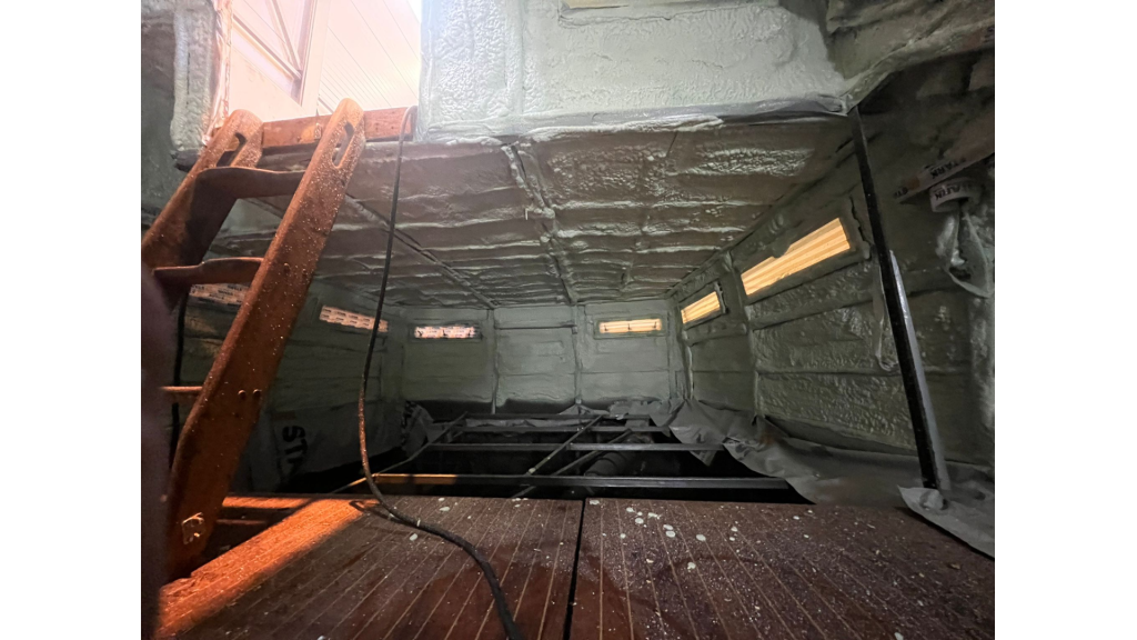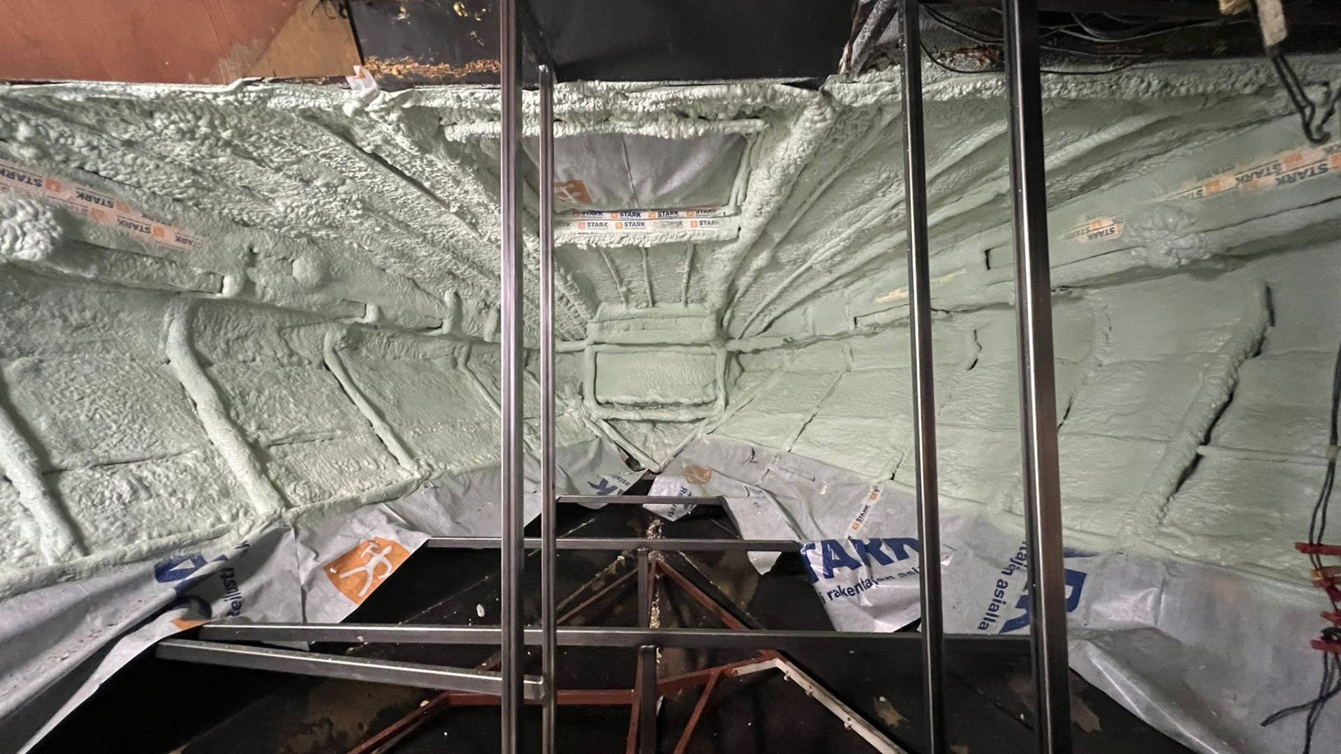 Ruiskutuskalustoomme kuuluu 70 metriä letkua, joten eristys onnistuu myös kauempana kalustoautosta. Tässä kohteessa eristettävä teräsvene oli vesillä, laituripaikalla. Eristeenä kaasutiivis ruiskutettava eriste, joka sopii erinomaisesti metallirakenteiden eristämiseen. Lämpöarvot tällä eristeellä ovat huippuluokkaa mahdollistaen ohuemmat eristepaksuudet, mikä on ahtaissa tiloissa suuri etu.