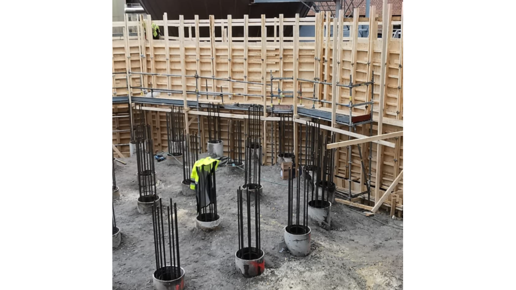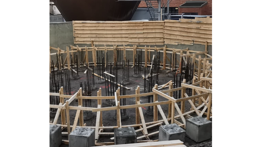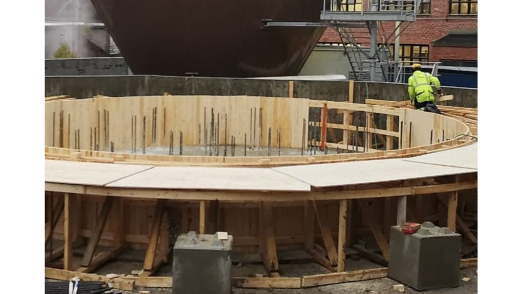 Kiertovesisäiliön perustusten muottityöt.